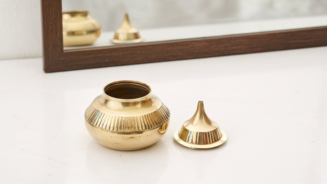 Tradition • Durability • Sacred Permanence This finely crafted brass kumkum–sindoor box embodies ritual strength and timeless tradition. Traditionally used in temple-style pooja settings, brass is revered for its ability to hold and amplify sacred energy, making this piece ideal for daily worship and long-term ritual continuity.