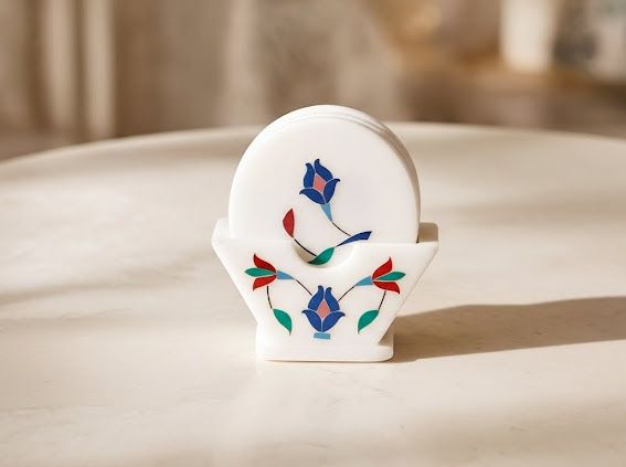 Heritage • Precision • Timeless Elegance This Rajasthani Handcrafted Marble Inlay Tea Coaster Set reflects the rich legacy of traditional inlay craftsmanship. Made from fine marble and adorned with intricate inlay work inspired by Rajasthani artistry, each coaster brings refined beauty and cultural depth to your tea and coffee moments. Designed to protect surfaces while elevating table aesthetics, these coasters add a sense of order, grace, and heritage charm to coffee tables, dining areas, and workspaces. Their detailed patterns and smooth finish make everyday serving feel thoughtful and special.
