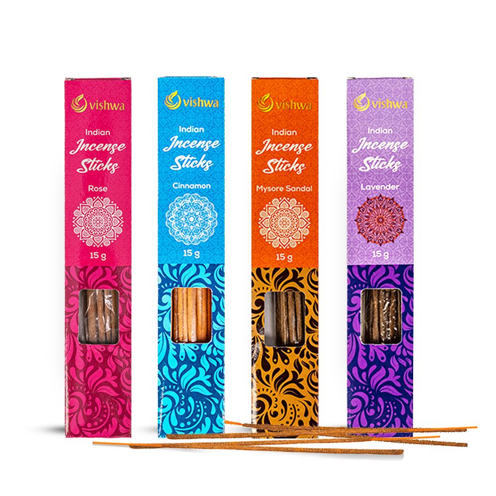 Mid-Range Incense Sticks Bundle – Temple Sacred Aromas • Balanced Fragrance • Daily Ritual Comfort (Rose + Cinnamon + Lavender + Sandalwood) Create a temple-like serenity in your space with the Temple Mid-Range Incense Sticks Bundle, a harmonious blend of Rose, Cinnamon, Lavender, and Sandalwood. This thoughtfully curated combination brings together devotion, warmth, calmness, and grounding, making it ideal for daily pooja, meditation, and peaceful living. The soft floral notes of Rose symbolize purity and devotion, Cinnamon adds a gentle warmth and energy, Lavender soothes the senses and reduces stress, while Sandalwood grounds the mind and enhances spiritual focus. Together, they recreate the divine ambience of a traditional temple, filling your surroundings with tranquility and balance. Inspired by Vedic sciences such as Agnihotra, Yoga, Ayurveda, Vastu, and Aromatherapy, these incense sticks are prepared using natural and traditional ingredients. Each stick is hand-blended with care to ensure a clean, even burn and a pleasant, lasting fragrance suitable for everyday rituals.